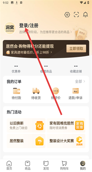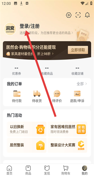 2、在进入到我的主页中,点击上方登录/注册按钮,准备进行登录操作。