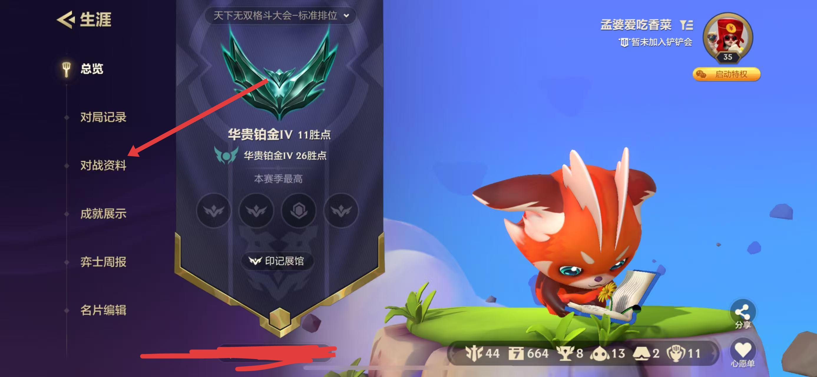 3、进入对战资料页面后,就能看到对战相关数据统计,包括段位排名超越的玩家比例、合成装备数量等信息。
