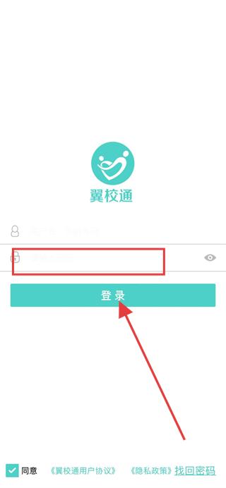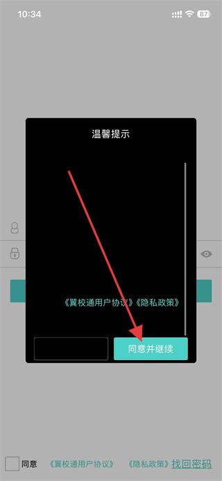 1、打开翼校通app,在弹出的提示框中点击同意并继续。