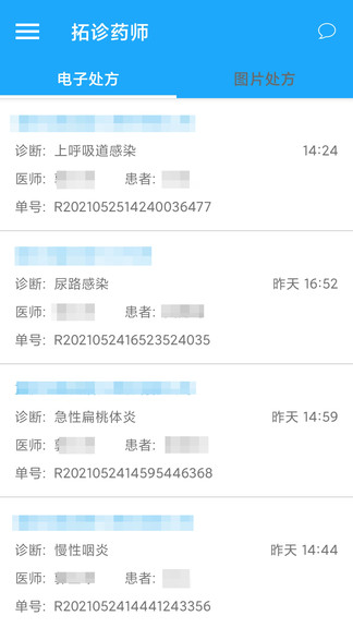 拓诊药师APP主要功能:药剂师注册,电子签名,平台审核,药剂师登录查看电子处方和纸质处方照片,判定审核结果,审核确认时需要药剂师人脸认证。所有处方审核都有药剂师审核痕迹,数据全程可追溯,系统自动统计药剂师本人审核的处方数目。