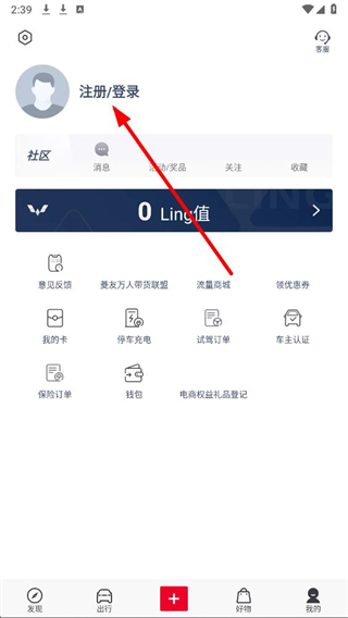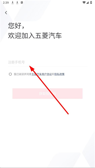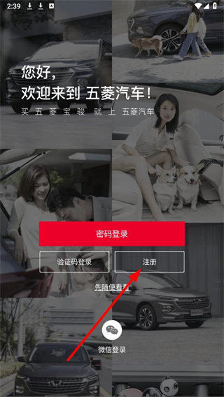 3、在界面中,点击注册选项,进入五菱汽车账号的注册页面。