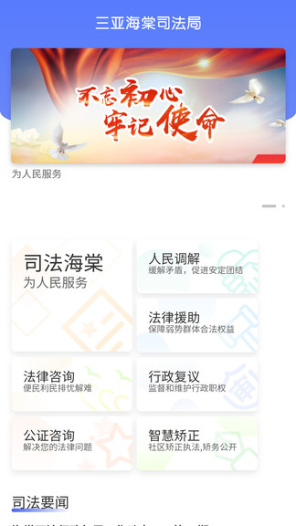 司法海棠APP包含三亚市海棠区司法局简介、人民调解、法律援助、法律咨询、行政复议、公证咨询、智慧矫正等功能。本应用主要用于普法宣传,进一步提高全体干部和广大人民群众的法律意识和法制观念,促进依法治国和依法管理各项事业的发展。
