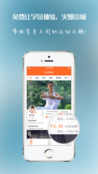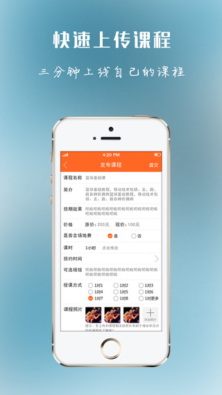 3.三分钟上线自己的课程:免签约,快速入驻"约教练"平台,让你周围的学员快速找到你