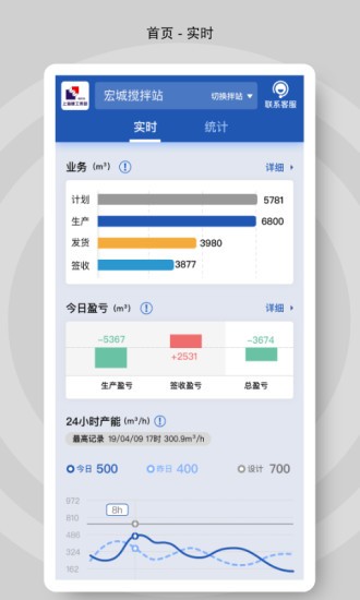 pc+app,搅拌站和工地完美连接。下单、生产、发货、签收,全程展现方量、车况、小票信息,实时可视化跟踪确保混凝土“滴水不漏”。