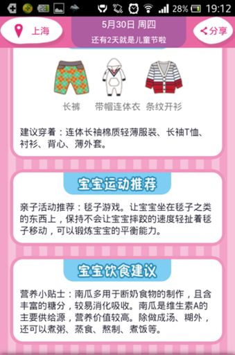 1、通过精确的天气预报,由专家给宝宝父母提供完备的宝宝穿衣指导、饮食指点、运动建议;