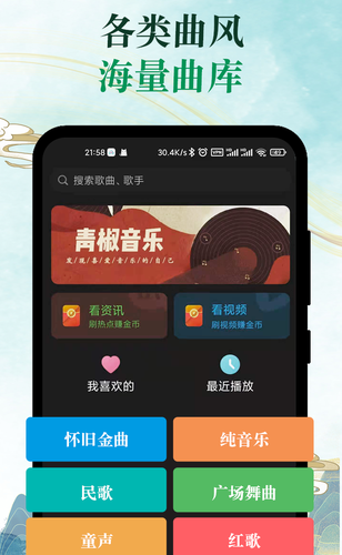 青椒音乐是优秀的音乐平台,在线支持各种类型的音乐资源,包括流行、摇滚、爵士、民族风等多种多样的歌曲,全天候的满足你的听觉需求,同时软件界面简介大方,常用功能一键直达,满足你的视觉需求,如果你喜欢听歌曲,不要错过青椒音乐,来一次充满视听盛宴的邂逅吧,一起来下载试试吧!