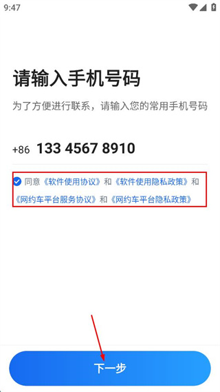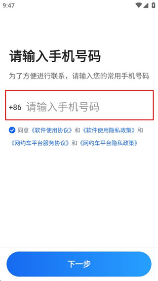 2、进入请输入手机号码页面,在对应输入框填写常用的手机号码,确认协议勾选状态。