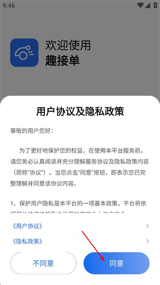 1、打开趣接单,查看弹出的用户协议及隐私政策内容,点击界面中的同意按钮。