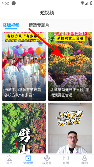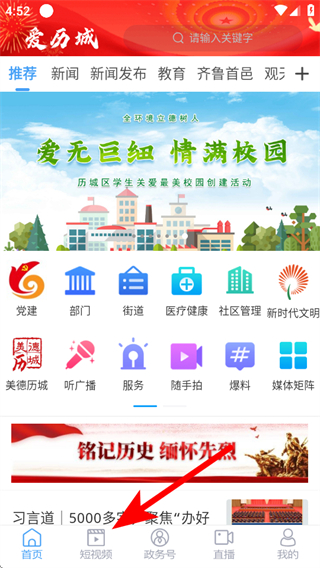 1、打开爱历城APP首页,点击底部短视频,进入短视频板块页面。