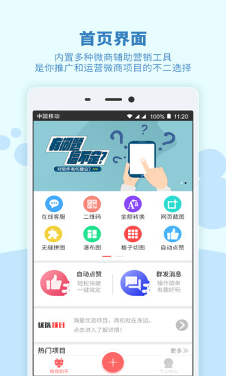 微商免费助手app是微商具备微商需要的各种微商营销,产品发布等功能,百万微商的不二选择。支持一键群发,一键点赞,在这里还可以发布您的产品让其他微商来帮你销售,让你轻轻松松简单做微商。
