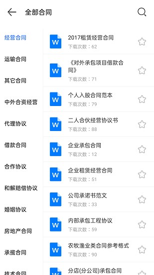 软件页面非常简约,功能十分全面,这里汇集了多种类型的合同模板,房屋租赁、劳动合同、运输合同等多种类型的都有提供。