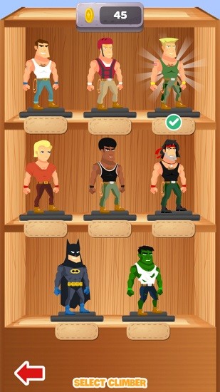 爬山肌肉英雄是一款休闲类的手机游戏,你在游戏中可以操控各种超级英雄来进行爬山,挑战自己的记录,看最高能够爬到哪里,游戏里的超级英雄也有不同的技能,选择合适的人物可以更好的过关,你还在等什么呢,快点来下载体验吧!