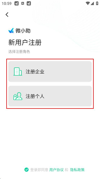 4、选择注册企业或注册个人,完成注册后即可使用微小助功能。