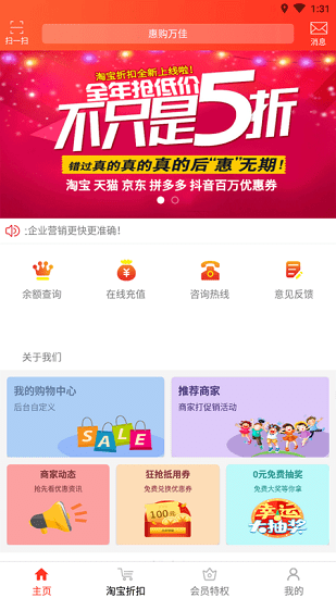 惠购万佳是一款非常实用的百货购物商城,货品丰富,资源充足,线上线下价格一致,下单快速配送,强大的物流系统,帮你送货到家;专为日常生活消费打造的特惠平台,从吃喝行玩购等各方面为您提供优惠,超多折扣哦在这里等你,每天优惠多多,享受更省钱的消费方式,给你更多实惠。