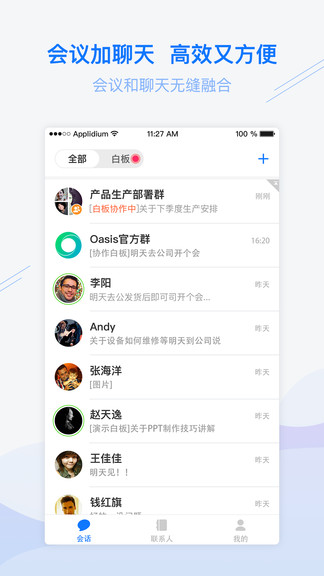 企联系,数字化会议让组织决胜未来,大数据时代的企业智能沟通云平台。企业内部可以随时进行会议,非常的方便,遇到工作问题可以随时交流沟通。可以有效提高办事效率,另外,这款软件还会自动记录会议内容,帮你复盘会议,记住会议中的每一个细节内容。企业内部的人员还可以在里面聊天,为紧张沉重的会议添加一丝丝活跃和缓解气氛。