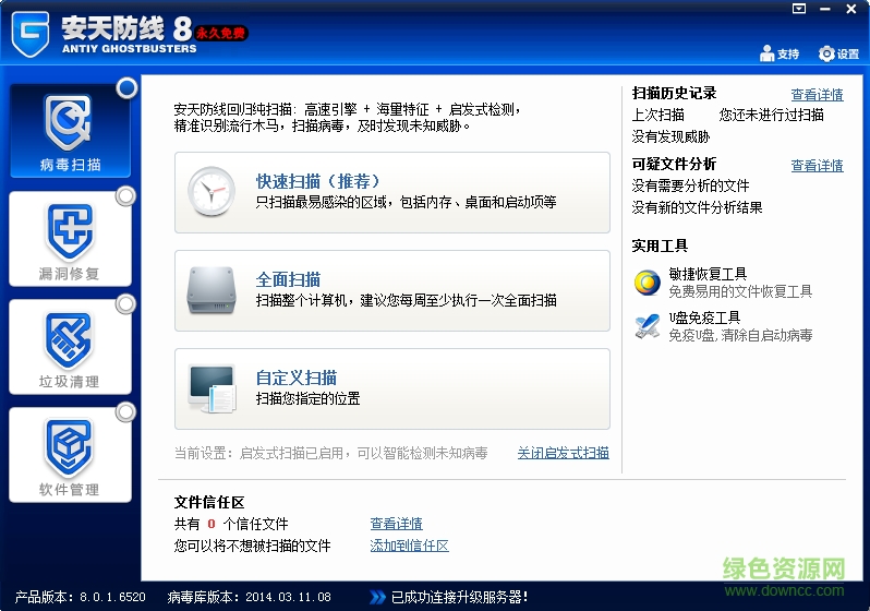 安天防线2008由安天出品,集查杀、清除、防御、管理于一体,拥有超大病毒库,能够查杀17万种、200万个病毒、黑客、后门、木马、蠕虫、流氓软件、盗号程序等有害程序。