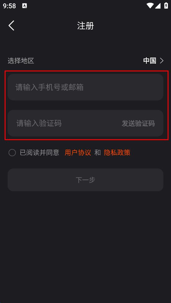 3、在注册页面输入手机号或邮箱,点击发送验证码并输入。
