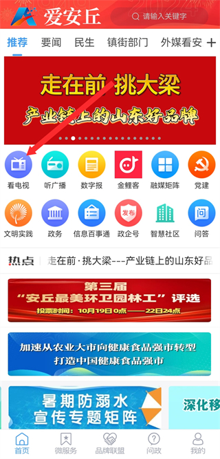 1、在爱安丘的首页,点击看电视的功能入口,进入电视的页面。