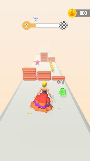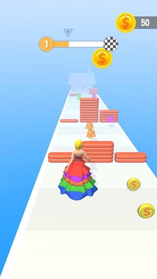 4、在游戏中玩家穿着群子,在未知的赛道上进行闯关挑战,断的收集布料,增加群子的长度。