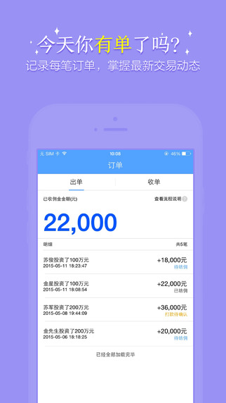 有单iPhone版是一款帮助用户理财投资的应用软件,在该应用中给每一位用户打造了一个挣钱的平台,让用户都能有所收益。上传自己的产品,让更多的朋友参与分销的行列,促使自己的产品销量更高,卖的更好。操作简单便捷,随时随地收单。欢迎下载使用~