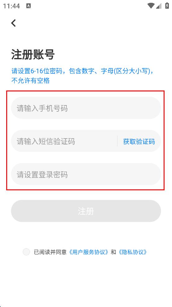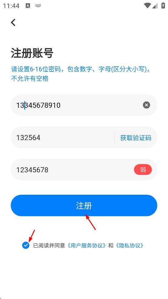 4、勾选“已阅读并同意用户服务协议和隐私协议,然后点击“注册”按钮,完成账号注册。