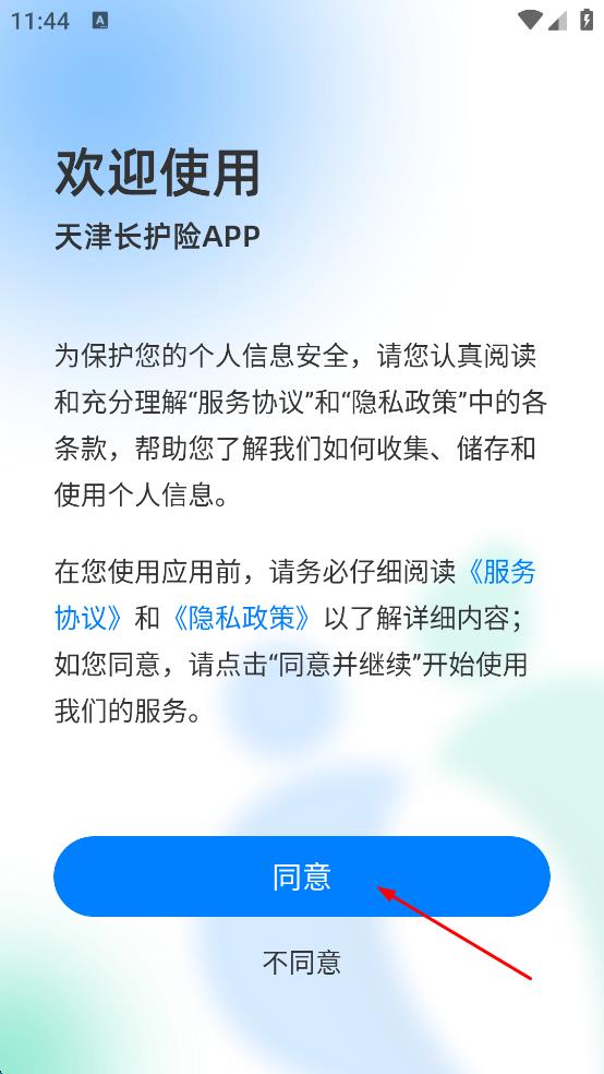 1、打开天津长护险APP,出现服务协议和隐私政策说明页面,点击“同意”按钮,进入登录界面。
