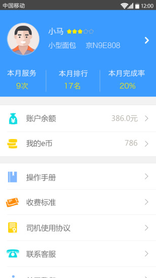 司机还可以通过e速运司机端app管理订单,查看服务次数和账户收入。