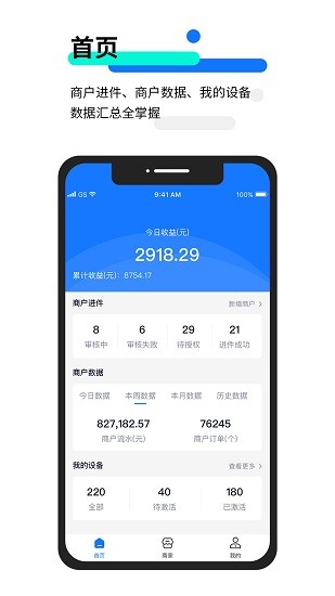 【首页】商户进件、商户数据、我的设备,数据汇总全掌握。