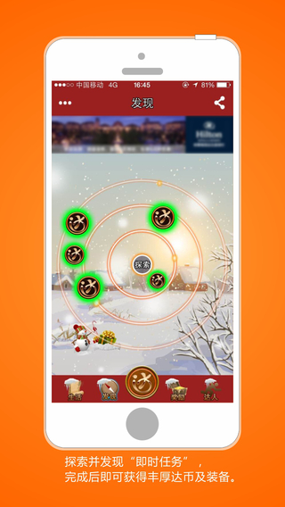 发现界面:选择达此,挑战生活中的未知!探索并发现“即时任务”,完成后即可获得丰富的达币及装备!