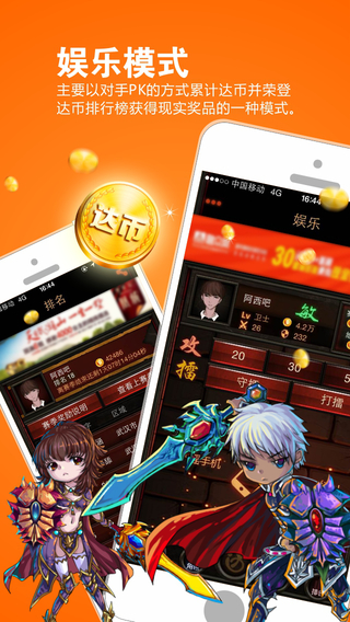 娱乐模式:“攻守兼备、一战到底、决战巅峰、装备熔炼”多样且创新的玩法,绚丽的技能效果和精美的画面,媲美大型网络游戏,首创真人竞技模式,手机摇一摇随机匹配选手,带用户体验最畅快、最激情的竞技之旅!