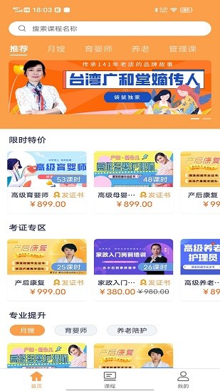 软件上拥有非常丰富的各种职业技能培训,包括专业茶艺师、养老护理员、家政服务员、西式烹调师以及家政服务人员。