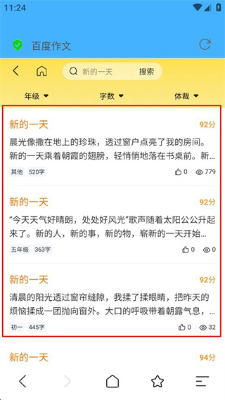 4、在作文列表界面,可查看多篇“新的一天”主题作文,选择感兴趣的作文查看详情。
