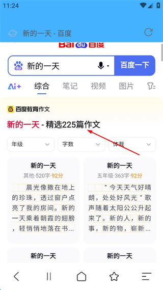3、在搜索结果界面,点击“新的一天 - 精选225篇作文”,进入作文列表界面。