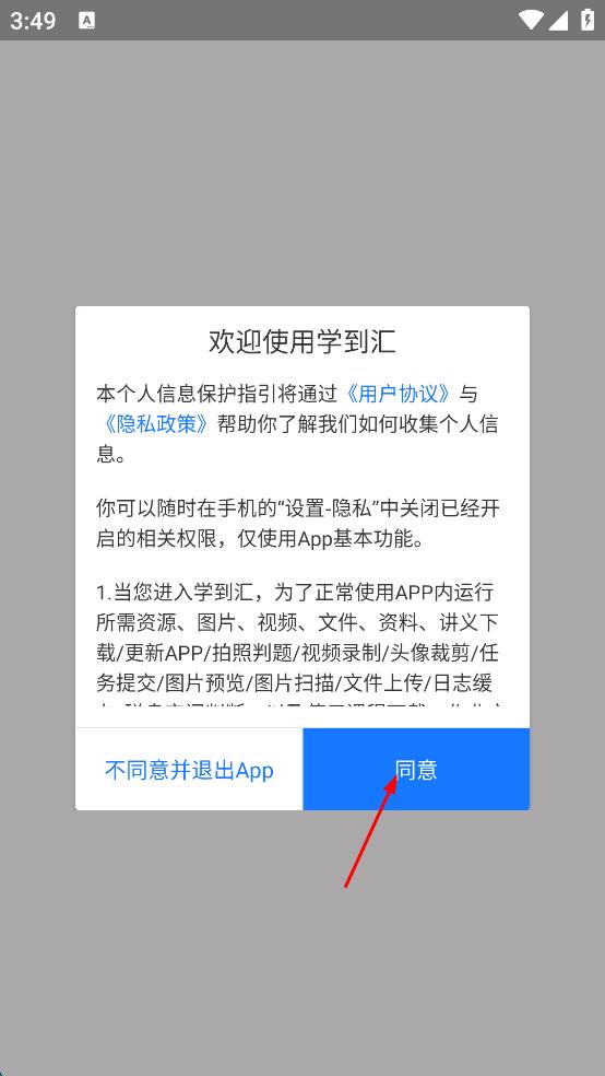 1、打开学到汇APP,会出现欢迎使用学到汇的提示页面,仔细查看后,点击“同意”按钮,进入登录页面。