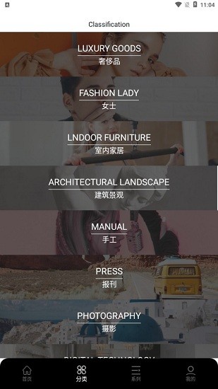3、平台有很多的风格分类的奢饰品、女生、男士、建筑景观、报刊,还有各种系类的杂志让你观看。