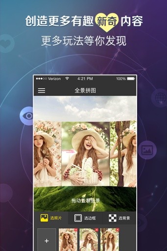 转转鸟APP采用引导式拍摄界面,领先的拼接合成算法,快速合成全景图片,可一键分享全景照片至微信、微博、qq空间等社交平台。此外,转转鸟手机APP支持几乎所有的iPhone机型,从iPhone4s开始的每一代iPhone上,都能够看到它的身影。近期转转鸟手机APP更是推出新版本,增加了很多新的功能,如新增“拍一圈”功能,能够让用户体验更快捷的360度拍摄效果。随心、随意、随时、随地玩转高清全景照片,只要安装转转鸟360度全景相机,即可轻松搞定。