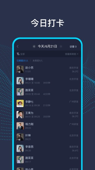 ai前台官方版非常好用的帮助企业统计前台的信息,让企业能够轻松记录下来所有员工每天的打卡情况,让人事人员在月底也能够根据统计更好地计算出勤率。在之后的更新中功能还会变得更加多样而强大,欢迎下载。