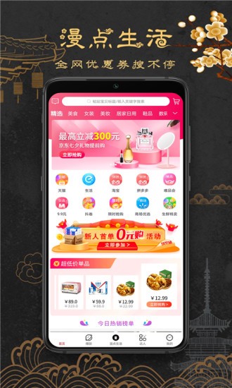 漫点生活app是手机网购类的应用软件,线上为您提供满意的电商服务,满足更多用户的需求。漫点生活app提供海量优惠券,比淘宝天猫直接买,省50%,绝对不花1笔冤枉钱。还有9.9包邮专场、限时秒杀等特色专区低价好物等你来抢!