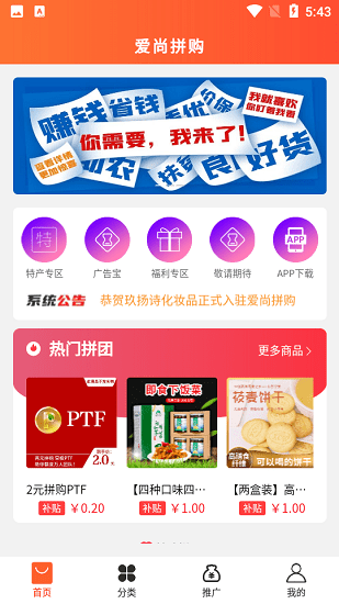 爱尚拼购,用最划算的价钱买最优质的农产品。app上有专门的推广专区,能够让农户上新自己家的农产品,平台给予扶持推广,让更多用户看见购买,从而促进销售。还有系统公告实时播放新入驻的商家,让用户关注到,从而获得更多选择的机会。有需要的用户赶紧下载体验吧。