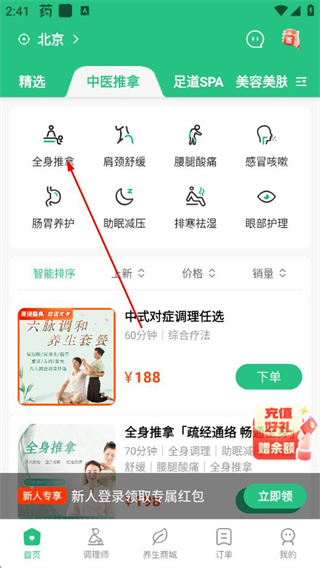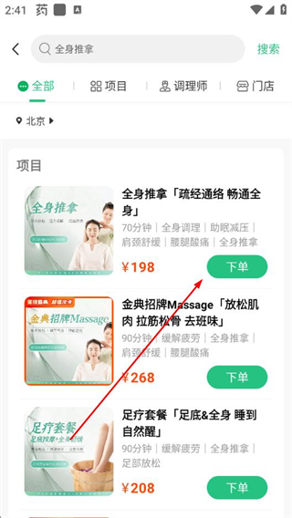 2、在中医推拿分类页面点击全身推拿选项,进入对应项目列表页面。