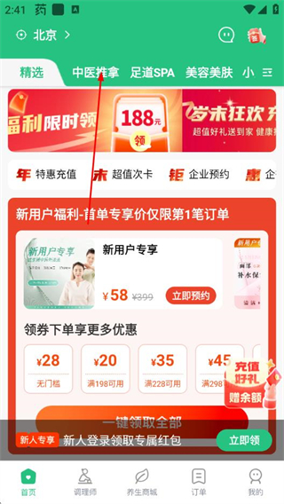 1、打开宜生健康App的首页,点击顶部的中医推拿选项,进入中医推拿分类页面。