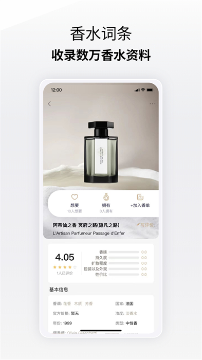 香水百科:收录了十几万瓶香水数据并持续更新,可以查询到任意香水的香调、调香师生平和品牌故事