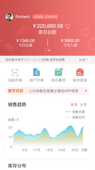 2、支持进行商品调拨、库存盘点、库存查询、库存报警;