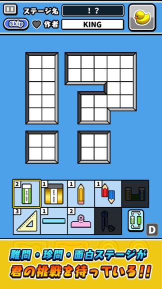 下一个橡皮擦是“插入拼图!”规则很简单!用文具填充所有准备好的正方形,以清除它们!有时间限制,所以请慢慢思考并玩!刺激你的大脑!困难的问题,罕见的问题,有趣的阶段!