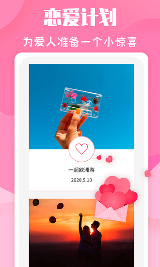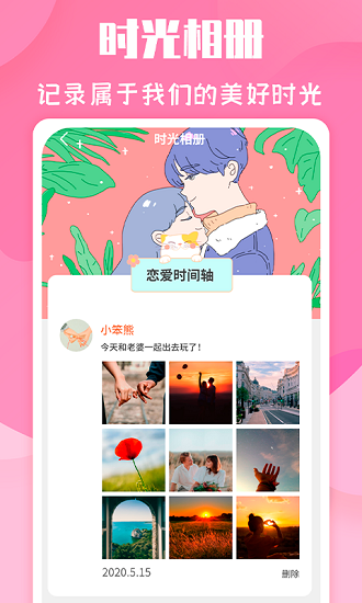 这里有存钱罐、倒数日、恋爱计划、时光相册、纪念日、情侣大学等多种实用功能,帮你留住每个与爱人的幸福瞬间,一起实现那些用心计划的美好愿望和小惊喜。