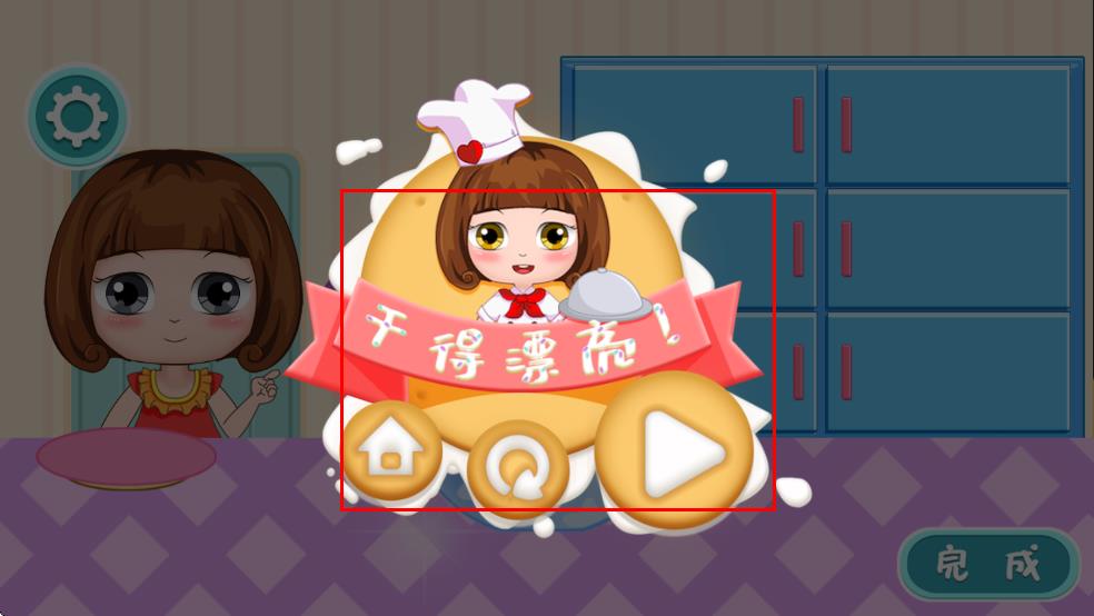 4、完成蛋糕制作后,界面出现干得漂亮的提示,可选择对应按钮继续游戏。
