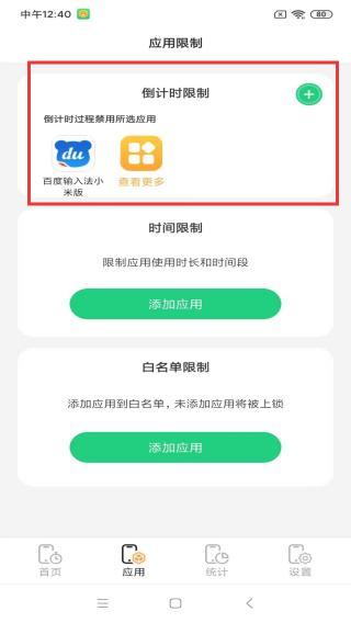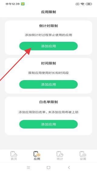 2、在应用限制的页面内,点击添加应用的功能按钮。