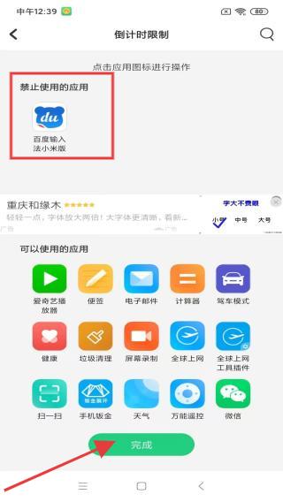 3、在倒计时限制的页面内,选择并点击需要限制的应用,再点击完成的按钮。