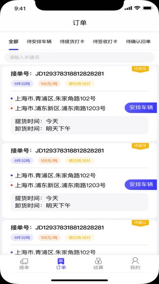2、在这里,用户能够清晰看到各个订单的接单号、货物重量和起始地等信息;
