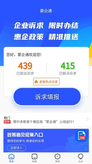 蒙企通以解决企业诉求和推送惠企政策为核心,搭建市场主体与政府实时、精准的沟通服务桥梁。实现自治区级、盟市级、旗县区级三级数据互通互联。